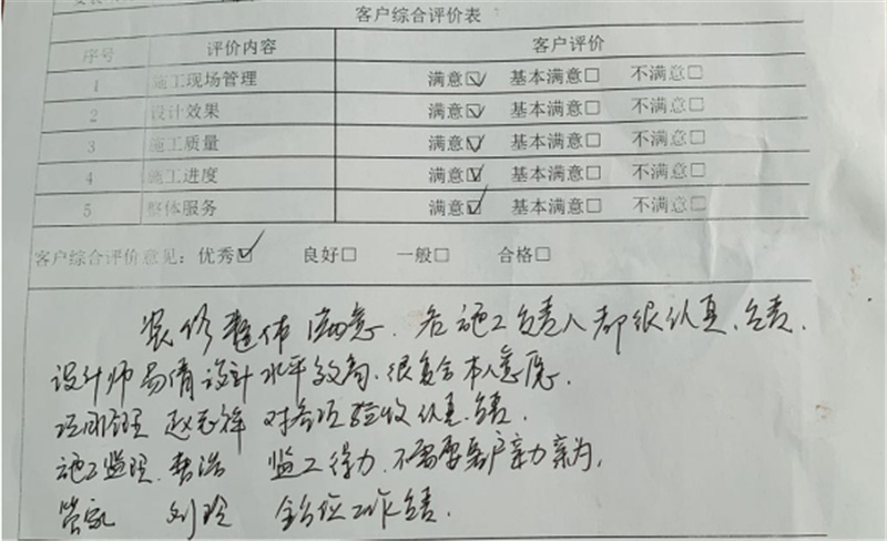 竣工驗(yàn)收單,客戶寫下對我們知音得衷心好評!客戶的滿意是我們不變的初衷前進(jìn)的道路,謝謝所有選擇我們知音的業(yè)主朋友們,感謝你們信任和認(rèn)可,知音會提供更貼近你們需求的服務(wù)。