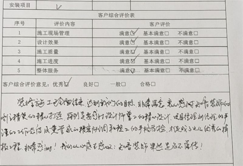 竣工驗(yàn)收單,客戶對(duì)我們知音作出衷心好評(píng)!客戶的滿意是我們不變的初衷。