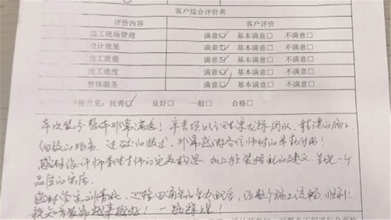 竣工驗(yàn)收單,客戶對(duì)我們知音作出衷心好評(píng)!客戶的滿意是我們不變的初衷。