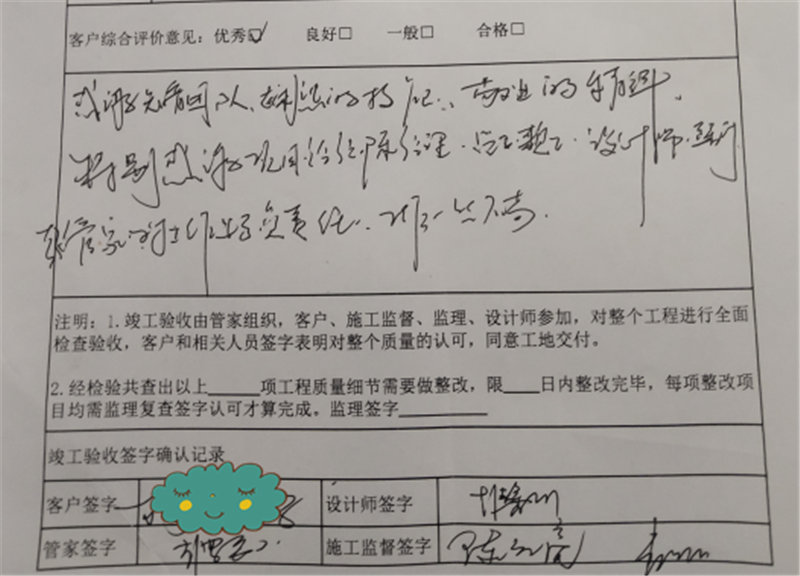 竣工驗(yàn)收單,客戶對我們知音作出衷心好評!客戶的滿意是我們不變的初衷。
