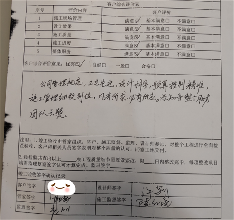 竣工驗收單,客戶對我們知音作出衷心好評!客戶的滿意是我們不變的初衷。