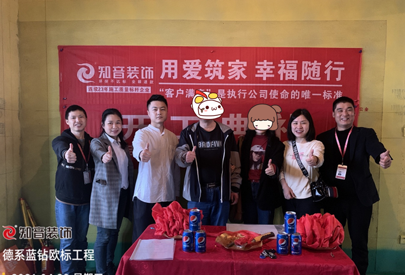 經過原屋儉收,電梯公共過道保護,鏟除墻皮,黃墻綠地保護,全房放線定位,全房放樣安全后,知音裝飾為每戶業(yè)主舉行隆重的開工儀式已表慶賀~