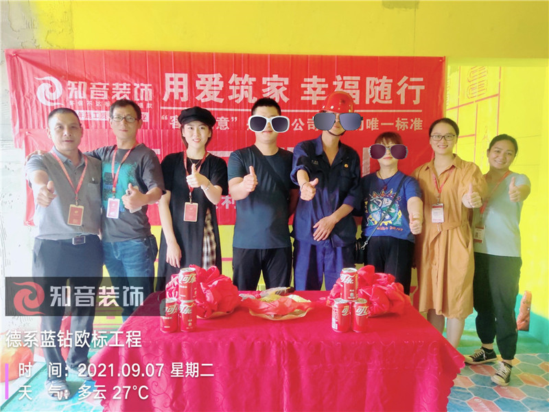 經(jīng)過原屋儉收,電梯公共過道保護(hù),鏟除墻皮,黃墻綠地保護(hù),全房放線定位,全房放樣安全后知音裝飾為每戶業(yè)主舉行隆重的開工儀式以表慶賀前期施工#