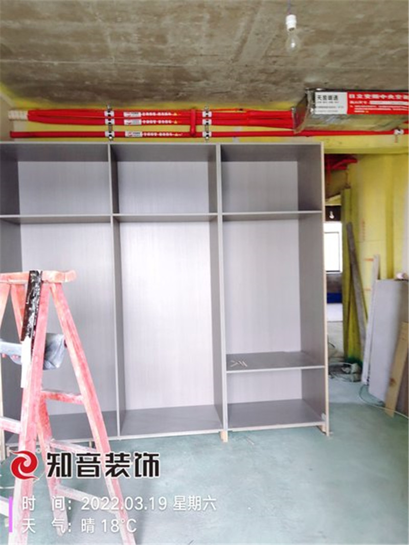 2、柜內(nèi)鋪貼飾面板時(shí),先進(jìn)行清潔、打磨后以白乳膠粘貼,再用少許蚊釘固定。接縫應(yīng)均勻、整齊,柜類所有木作的固定,連接必須使用白乳膠再釘釘子固定。