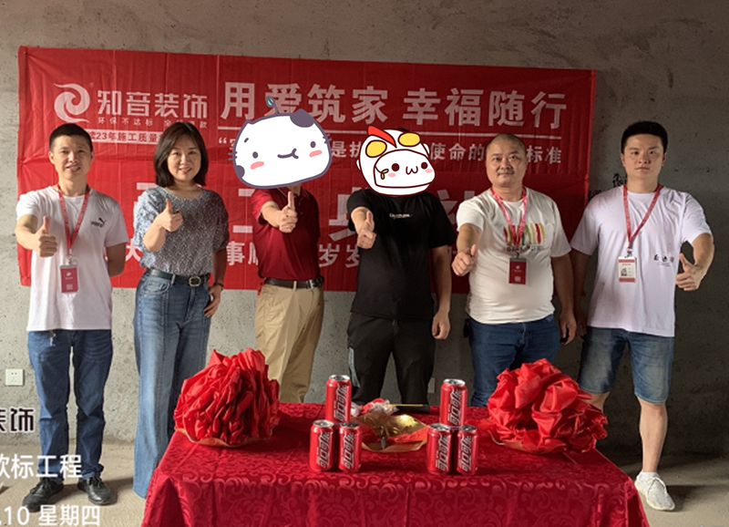 經(jīng)過原屋儉收,電梯公共過道保護(hù),鏟除墻皮,黃墻綠地保護(hù),全房放線定位,全房放樣安全后知音裝飾為每戶業(yè)主舉行隆重的開工儀式以表慶賀