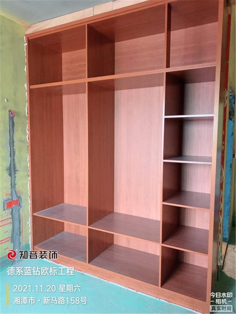 2、柜內(nèi)鋪貼飾面板時,先進行清潔、打磨后以白乳膠粘貼,再用少許蚊釘固定。接縫應(yīng)均勻、整齊,柜類所有木作的固定,連接必須使用白乳膠再釘釘子固定。