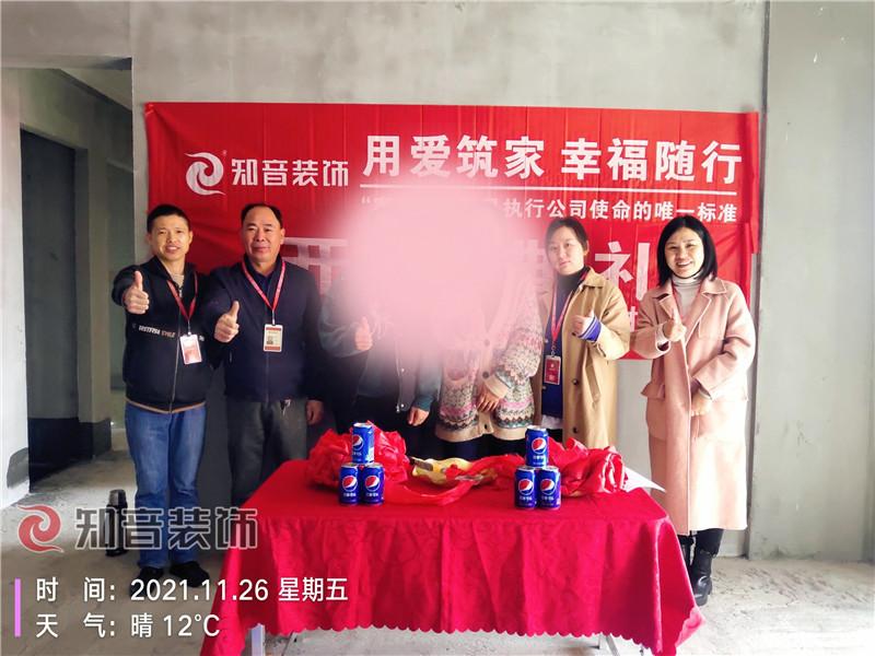 經(jīng)過原屋儉收,電梯公共過道保護(hù),鏟除墻皮,黃墻綠地保護(hù),全房放線定位,全房放樣安全后知音裝飾為每戶業(yè)主舉行隆重的開工儀式以表慶賀