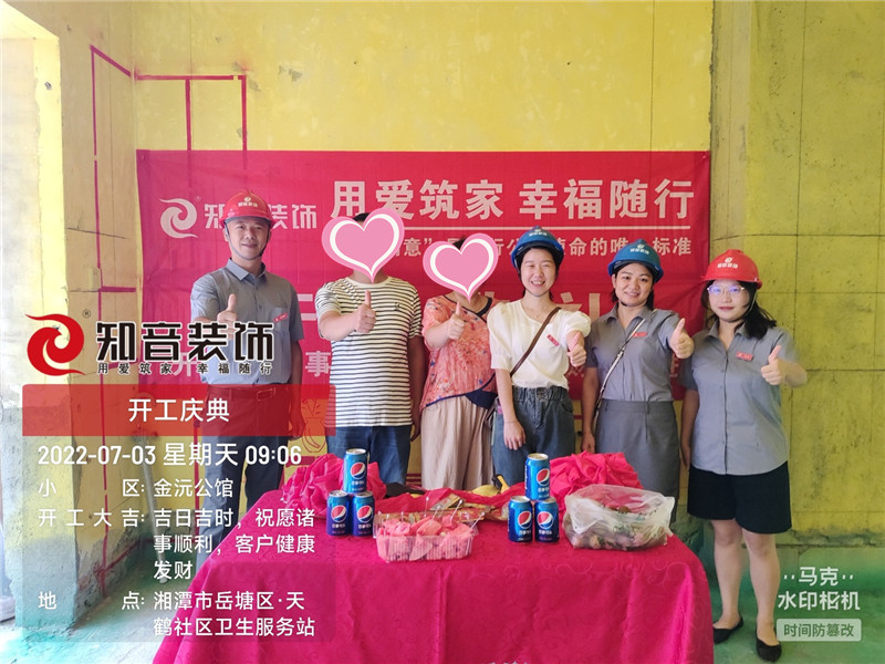 經(jīng)過原屋儉收,電梯公共過道保護(hù),鏟除墻皮,黃墻綠地保護(hù),全房放線定位,全房放樣安全后知音裝飾為每戶業(yè)主舉行隆重的開工儀式以表慶賀