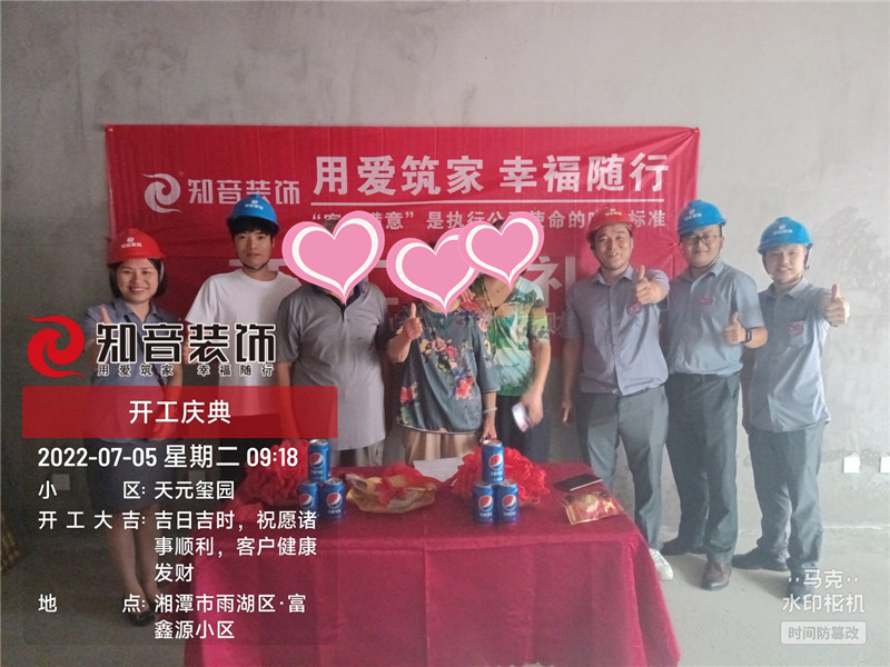 經(jīng)過原屋儉收,電梯公共過道保護(hù),鏟除墻皮,黃墻綠地保護(hù),全房放線定位,全房放樣安全后知音裝飾為每戶業(yè)主舉行隆重的開工儀式以表慶賀