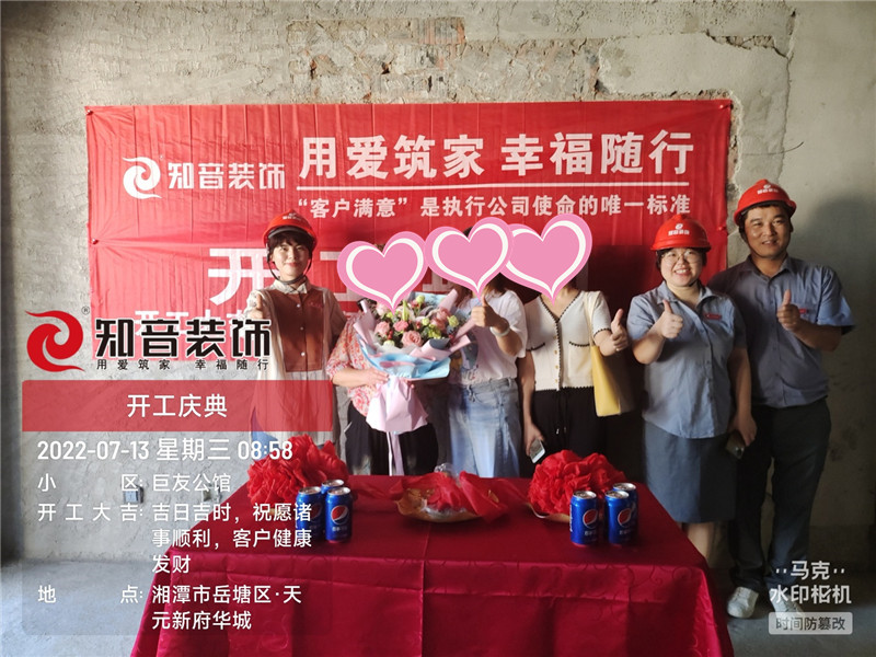 經(jīng)過(guò)原屋儉收,電梯公共過(guò)道保護(hù),鏟除墻皮,黃墻綠地保護(hù),全房放線定位,全房放樣安全后知音裝飾為每戶業(yè)主舉行隆重的開(kāi)工儀式以表慶賀