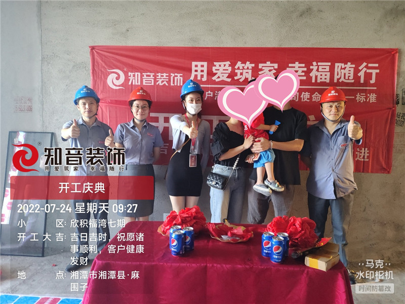 經(jīng)過(guò)原屋儉收,電梯公共過(guò)道保護(hù),鏟除墻皮,黃墻綠地保護(hù),全房放線定位,全房放樣安全后知音裝飾為每戶業(yè)主舉行隆重的開(kāi)工儀式以表慶賀