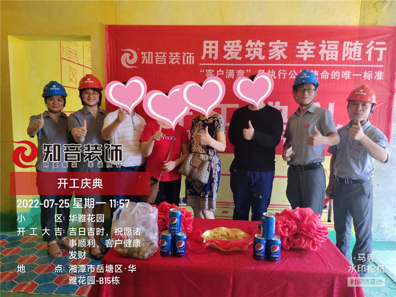 經(jīng)過原屋儉收,電梯公共過道保護(hù),鏟除墻皮,黃墻綠地保護(hù),全房放線定位,全房放樣安全后知音裝飾為每戶業(yè)主舉行隆重的開工儀式以表慶賀