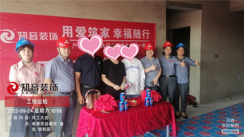 經(jīng)過(guò)原屋儉收,電梯公共過(guò)道保護(hù),鏟除墻皮,黃墻綠地保護(hù),全房放線定位,全房放樣安全后知音裝飾為每戶業(yè)主舉行隆重的開(kāi)工儀式以表慶賀