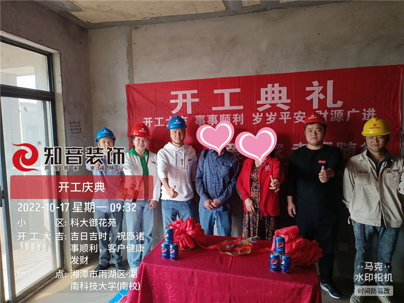 經過原屋儉收,電梯公共過道保護,鏟除墻皮,黃墻綠地保護,全房放線定位,全房放樣安全后知音裝飾為每戶業(yè)主舉行隆重的開工儀式以表慶賀