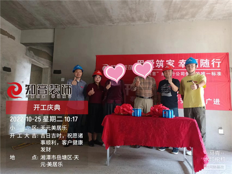 經(jīng)過原屋儉收,電梯公共過道保護,鏟除墻皮,黃墻綠地保護,全房放線定位,全房放樣安全后知音裝飾為每戶業(yè)主舉行隆重的開工儀式以表慶賀