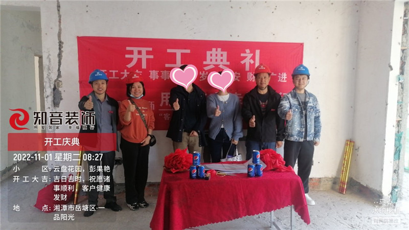 經(jīng)過(guò)原屋儉收,電梯公共過(guò)道保護(hù),鏟除墻皮,黃墻綠地保護(hù),全房放線定位,全房放樣安全后知音裝飾為每戶業(yè)主舉行隆重的開(kāi)工儀式以表慶賀