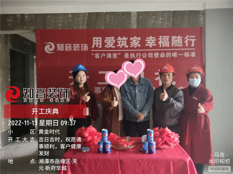 經過原屋儉收,電梯公共過道保護,鏟除墻皮,黃墻綠地保護,全房放線定位,全房放樣安全后知音裝飾為每戶業(yè)主舉行隆重的開工儀式以表慶賀