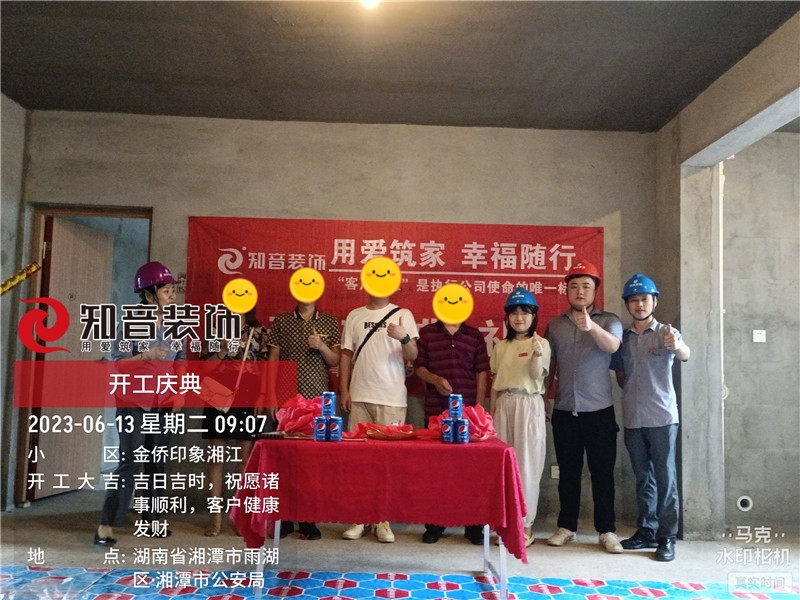 經(jīng)過原屋儉收,電梯公共過道保護,鏟除墻皮,黃墻綠地保護,全房放線定位,全房放樣安全后知音裝飾為每戶業(yè)主舉行隆重的開工儀式以表慶賀