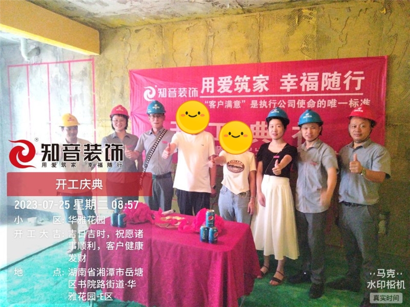 經(jīng)過原屋儉收,電梯公共過道保護(hù),鏟除墻皮,黃墻綠地保護(hù),全房放線定位,全房放樣安全后知音裝飾為每戶業(yè)主舉行隆重的開工儀式以表慶賀