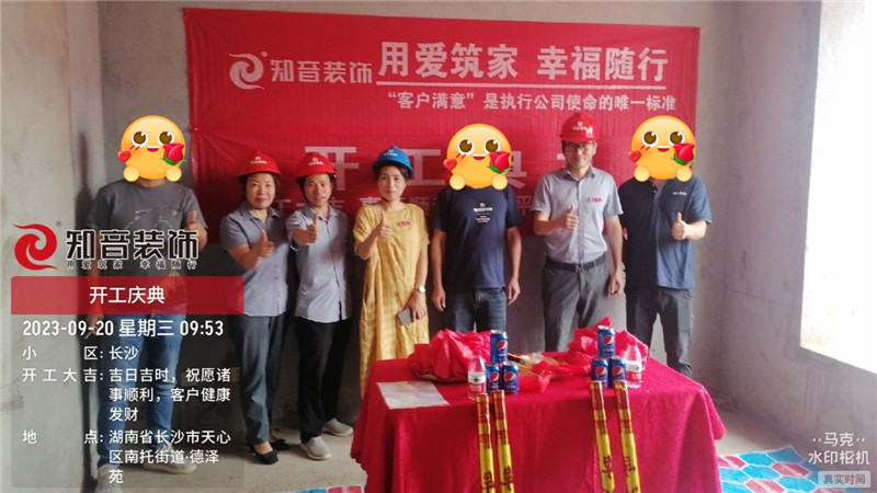 經(jīng)過原屋儉收,電梯公共過道保護(hù),鏟除墻皮,黃墻綠地保護(hù),全房放線定位,全房放樣安全后知音裝飾為每戶業(yè)主舉行隆重的開工儀式以表慶賀
