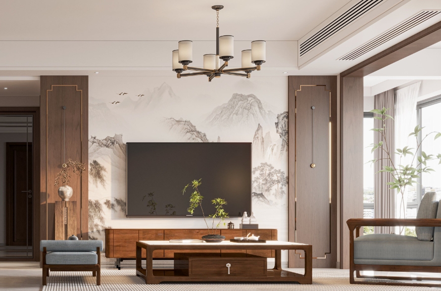 設(shè)計理念:新中式空間大多采用簡潔硬朗、橫平豎直的線條。簡潔的線條,會讓空間更加的純粹,更富現(xiàn)代感。這種簡潔而流暢的線條的使用,讓空間既高級又雅致。新中式風(fēng)格融合了現(xiàn)代化元素的時尚簡潔和傳統(tǒng)中式元素的神韻。好比室內(nèi)空間墻上的掛畫采用水墨畫,用深深淺淺、有濃有淡的筆觸,寥寥數(shù)筆就用簡單的輪廓和靈動的線條勾勒出主體的神韻。