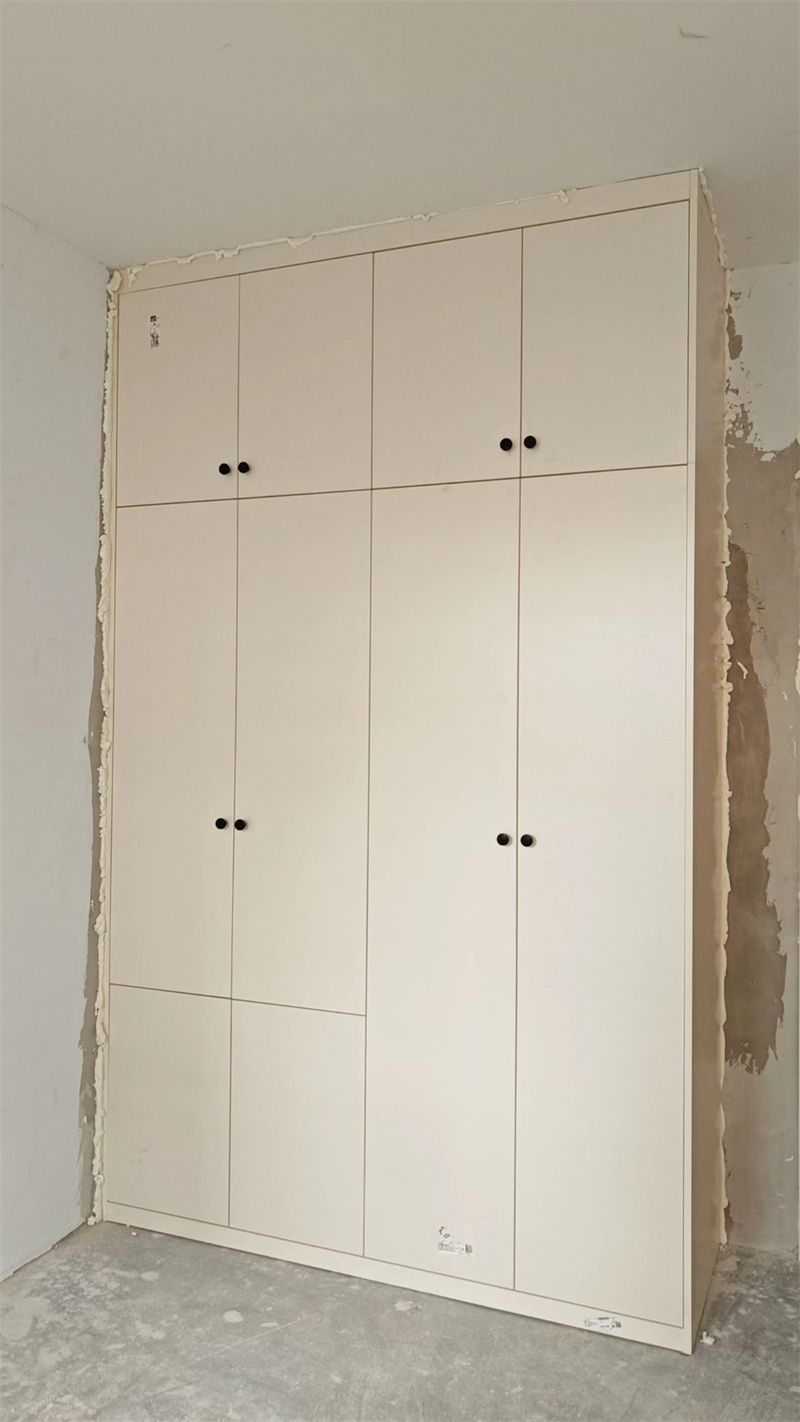 2、柜內(nèi)鋪貼飾面板時(shí),先進(jìn)行清潔、打磨后以白乳膠粘貼,再用少許蚊釘固定。接縫應(yīng)均勻、整齊,柜類所有木作的固定,連接必須使用白乳膠再釘釘子固定。