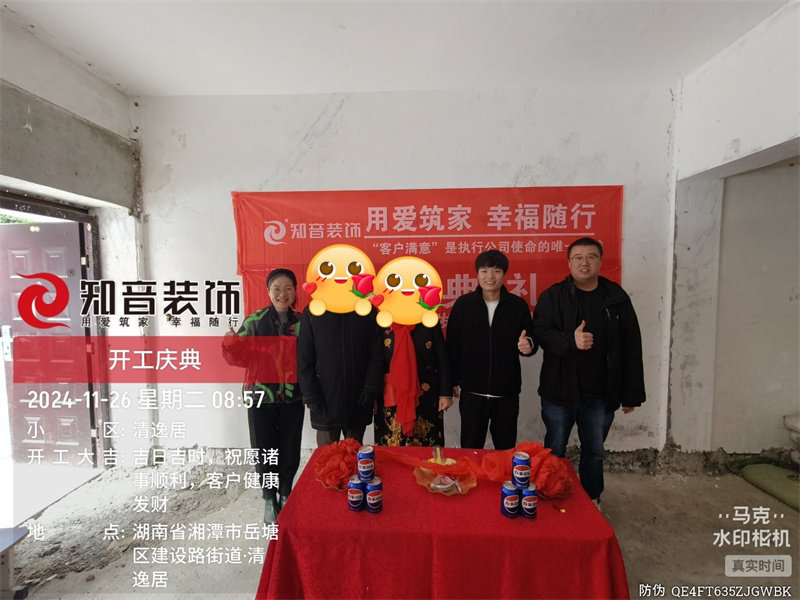 經(jīng)過原屋儉收,電梯公共過道保護,鏟除墻皮,全房放線定位后知音裝飾為每戶業(yè)主舉行隆重的開工儀式以表慶賀