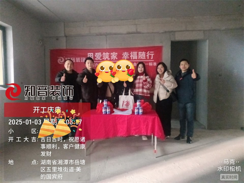 經(jīng)過原屋儉收,電梯公共過道保護,鏟除墻皮,全房放線定位后知音裝飾為每戶業(yè)主舉行隆重的開工儀式以表慶賀