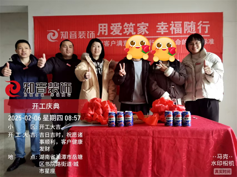 經(jīng)過(guò)原屋儉收,電梯公共過(guò)道保護(hù),鏟除墻皮,全房放線定位后知音裝飾為每戶業(yè)主舉行隆重的開(kāi)工儀式以表慶賀