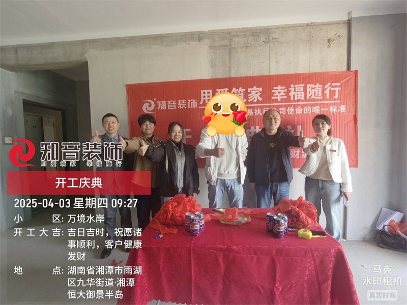 經(jīng)過原屋儉收,電梯公共過道保護,鏟除墻皮,全房放線定位后知音裝飾為每戶業(yè)主舉行隆重的開工儀式以表慶賀