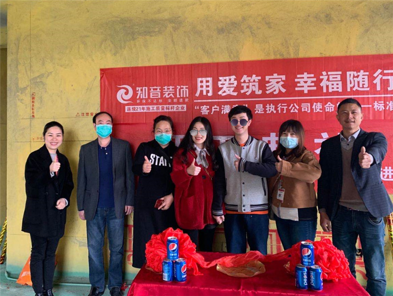 經過原屋驗收,電梯公共過道保護,鏟除墻皮,黃墻綠地保護,全房放線定位,全房放樣安全防護、安全文明標牌懸掛、窗貼、門貼、燃氣表電表箱保護、消防器材布置,以上各項工作完畢,舉行儀式,標志正式進入施工階段。