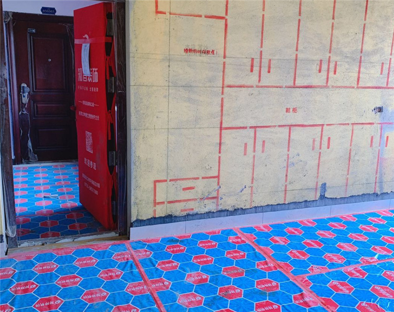 搬運(yùn)建材上樓,使用專用透明保護(hù)膜粘貼在地面,目的是保持新鋪貼地磚的潔凈,同時(shí)避免地磚在后期施工中劃傷。入戶門(mén)使用專用保護(hù)門(mén)套。